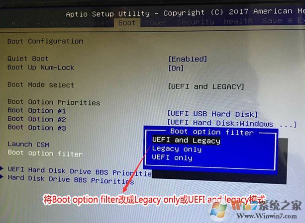2。重新启动后,按DELETE,输入启动选项,然后将启动选项归档器设置为仅Legaly或UEFI和Legaly,如下图所示;