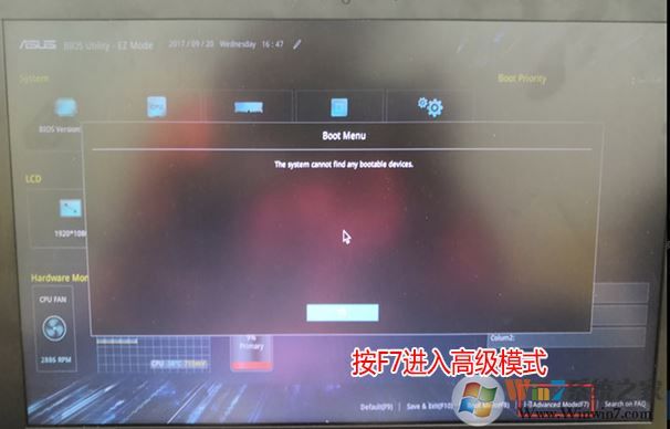 华硕灵睿 K20CD预装win10改win7教程步骤二:BIOS修改与U盘启动1。重新启动笔记本,然后按ESC进入BIOS设置,然后按F7进入高级模式,如下图所示;