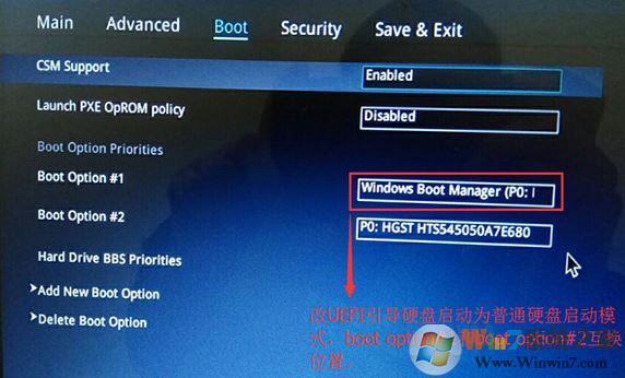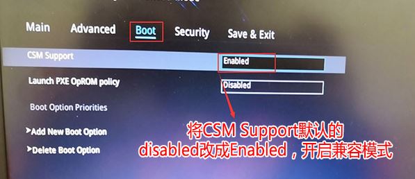 3。切换到引导选项,将CSM支持从禁用到启用,然后启用兼容模式;
