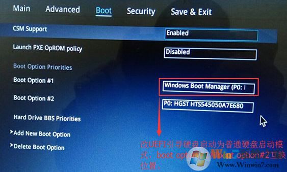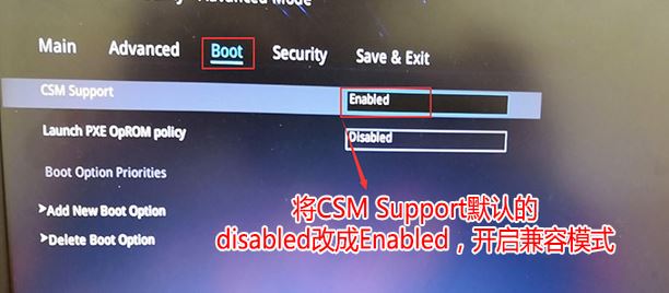 3。切换到引导选项,将CSM支持从禁用到启用,然后启用兼容模式;