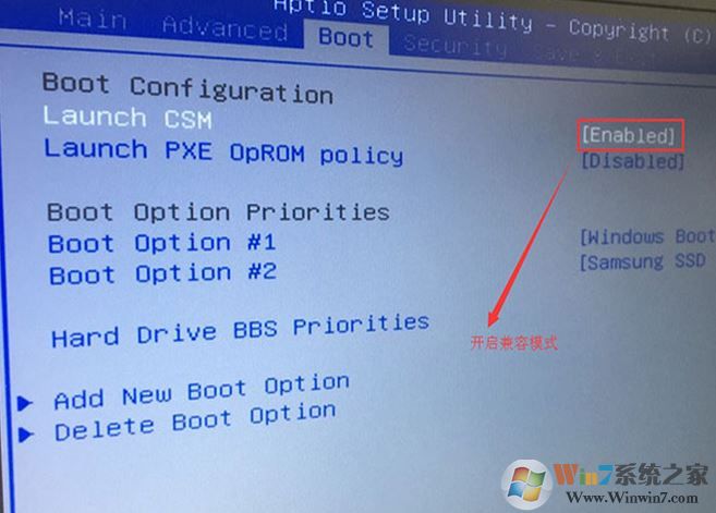 2。重新启动后,切换到启动选项,将启动CSM从禁用到启用,然后启用兼容模式;
