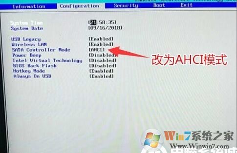 6。注意:返回配置项目,然后检查SATA控制器模式项目。如果默认硬盘模式是突袭或RST模式,请将硬盘模式更改为AHCI模式。否则,进入PE后将无法识别硬盘。如果更改它,请记住按F10保存,如下图所示;