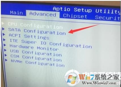 2。输入BIOS后,我们首先将键盘的方向移至右侧,切换到高级选项,找到SATA配置并输入,然后将SATA模式选择硬盘模式更改为AHCI。否则,如果我们使用RAID模式,则在输入PE后找不到硬盘,如下图所示。