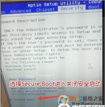 3。然后按键盘的右键切换到安全选项,选择“安全启动”以输入安全设置选项,然后输入并更改启用安全启动的默认启用,以关闭安全启动。必须关闭此项目,否则您将无法在安装Win7后进入系统,如下图所示;