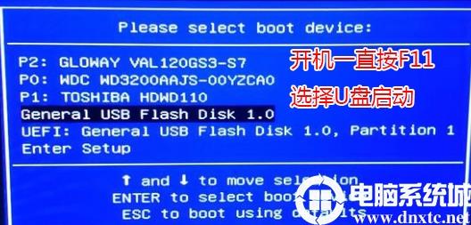 6。插入U磁盘启动磁盘,连续按F11选择以识别的USB磁盘启动项目(默认值是UEFI U Disk启动和传统模式。在这里,请记住,如果您希望UEFI启动,则需要创建一个支持UEFI的USB磁盘),并按下Enter Enter Enter,如下图所示;