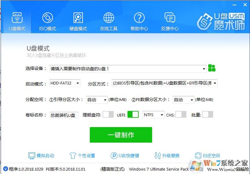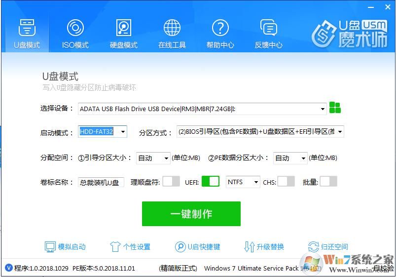 4。插入USB闪存驱动器,然后选择引导模式。不要在这里更改它,并使用HDD-FAT32。然后,如果您需要UEFI,请打开UEFI开关,然后选择USB闪存驱动器的NTFS格式。否则,您将无法张贴大型4G或上方的系统图像,请单击一单击以开始;
