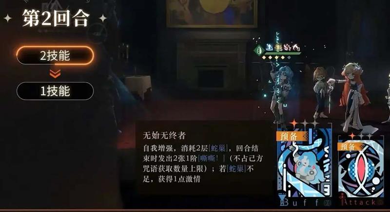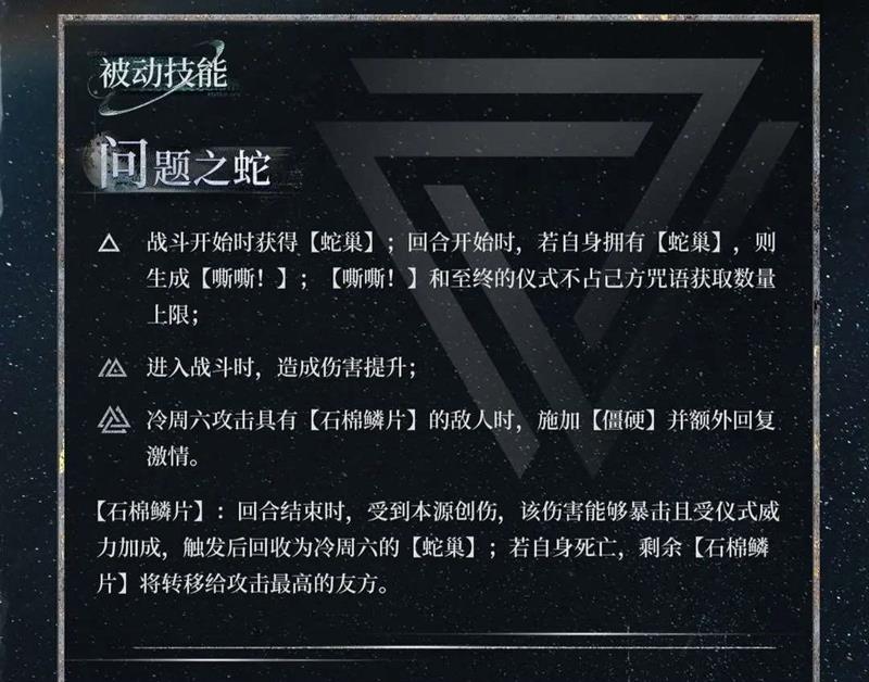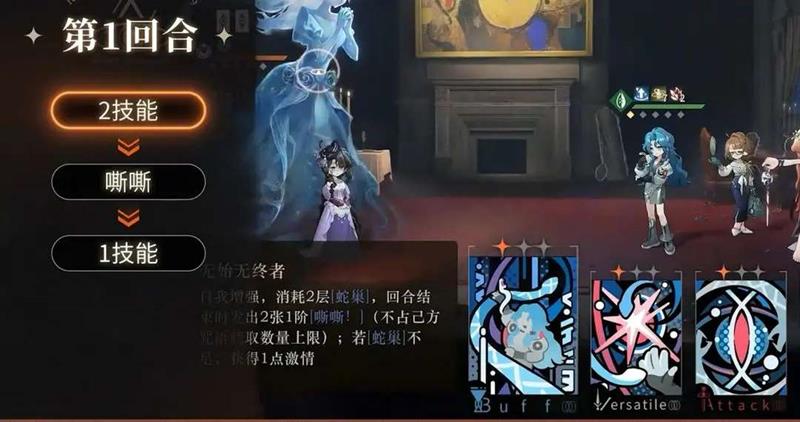 四、技能介绍寒冷的星期六依靠8个小蛇在战斗中输出。在游戏开始时,小蛇以“蛇巢”的形式位于寒冷的星期六的头上。当您了解第一和第二技能时,“蛇巢”将转换为攻击卡“嘶嘶声”。 “嘶嘶声”的力量是,我们可以在不消耗动作点的情况下攻击敌人,并在袭击发生后悬挂“石棉鳞片”。