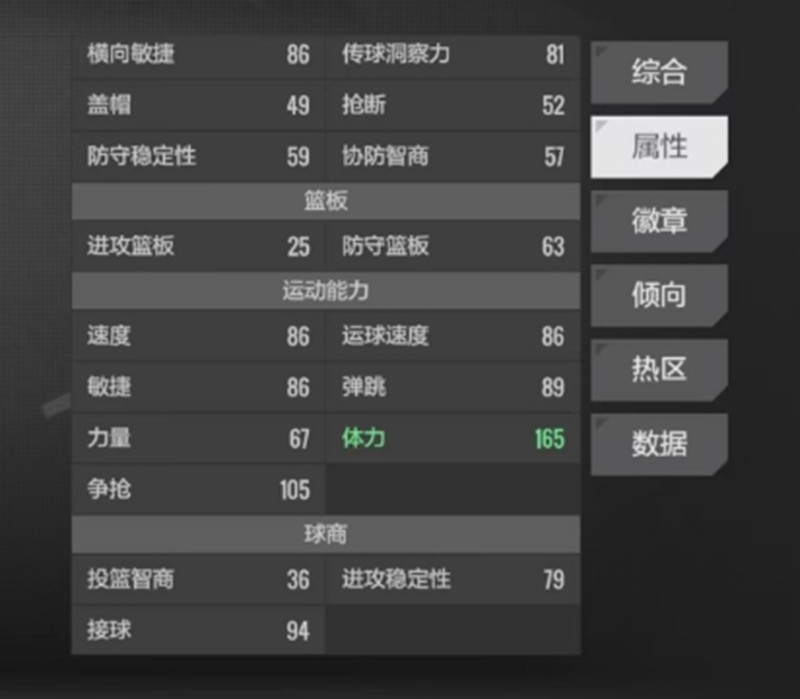 哈登的运动价值达到86分,这使他在球场上具有极强的突破能力。水平敏捷性也达到了86分,这使他可以轻松地完成球时的方向变化。 81分传球洞察力使他在组织进攻时可以准确地找到队友的位置,并经常提供精美的助攻。但是,25分的进攻篮板和63分的防守篮板数据确实并不出色,这是他在内部对抗中的弱点。