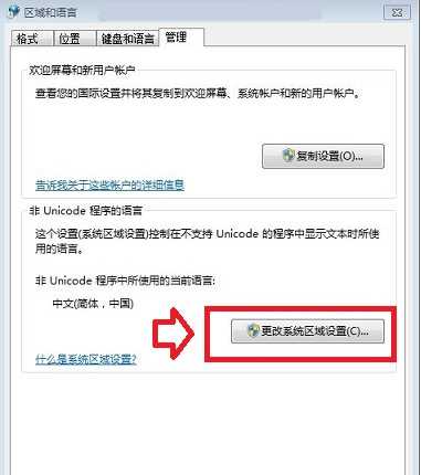 接下来,“区域和语言”属性对话框将弹出,然后在顶部切换到“管理选项”,然后单击底部的“更改系统位置”,如下图所示: