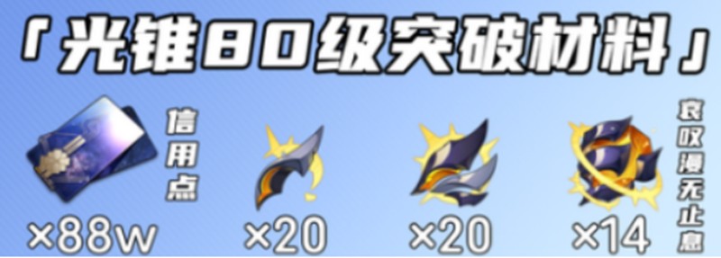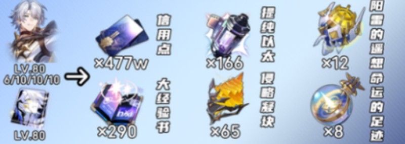 除了角色突破外,光锥和轨道的培养还需要大量资源。总共需要477万学分和290本大这本书。就材料而言,需要166个纯净的以太货币,65个入侵的凝块,12个Yang Thunder的想法和8个足迹。哀叹无休止地需要76蓝色,91紫色,87金和22蓝色,81紫色和154金。
