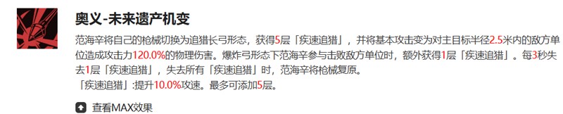 范·赫尔辛(Van Helsing)的神秘技能使他可以从枪支形态切换到弓形,同时获得了五个级别的快速狩猎效果。每次击败敌人时,您都会提高攻击速度,并且自然会每三秒钟丢失一次效果。这种机制要求玩家准确地控制战斗节奏,并在五层效果满足时具有惊人的输出能力。