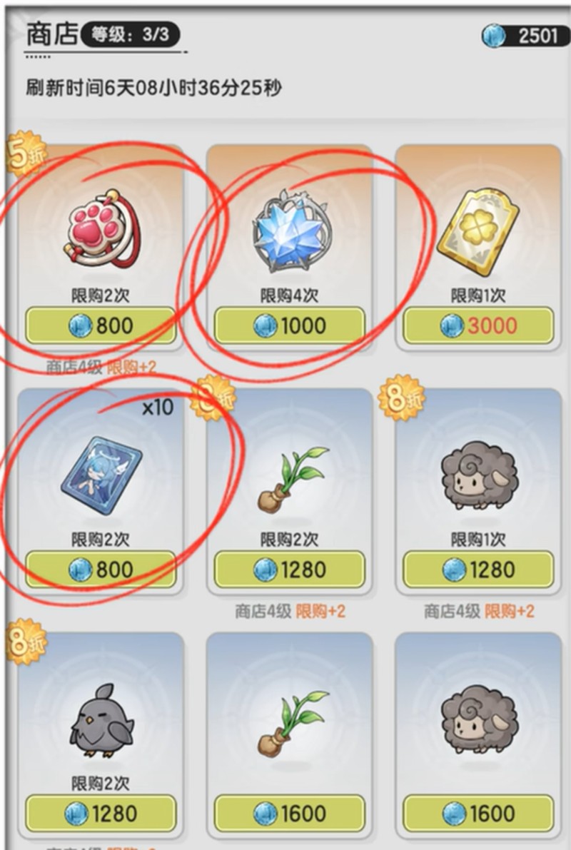 在硬币店里花费时,建议每天手动两次手动刷新商店。如果有足够的金币,您将优先购买资源产品和女神卡。当金币太多时,您只会选择折扣产品。宝藏中的女神卡,命运的果实和授权书是高价值道具,应优先购买。建议以不到60的折扣购买其他材料产品,以确保成本效益。