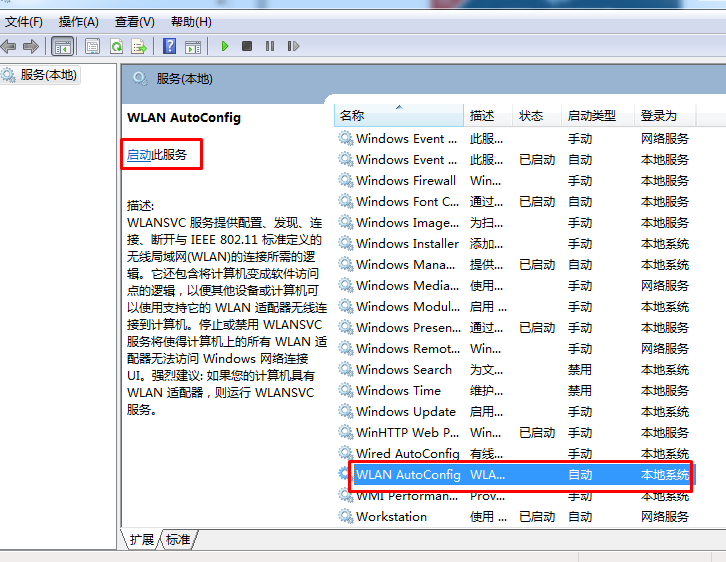 2。在本地服务列表中找到WLAN AutoConfig服务,我们看到它尚未启动;
