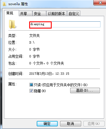 3。目前,我们打开Dianying文件夹属性,您可以看到隐藏的选项已经可用,因此我们可以公开设置它。
