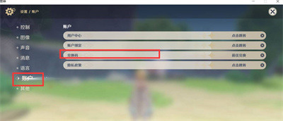 3、在设置界面,点击账户界面,可以看到兑换码的输入栏;