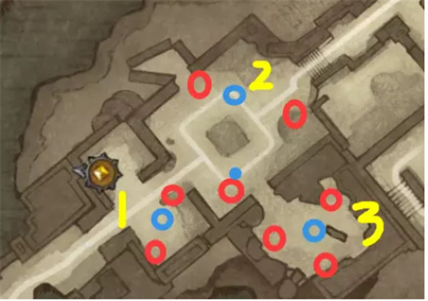 一共3个区域(标记1~3),2号点一个站上面一个在下面可以稍微游走打,其他一人守2波,3号点有3波怪,3号的玩家非常重要,不要漏怪,也是把握连击的关键人。