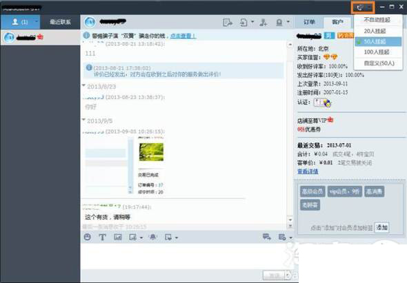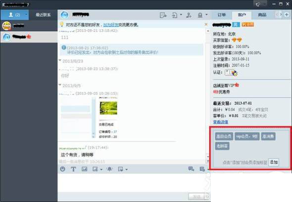 旺旺聊天对话框--顾客中可建立和设定顾客标识。商家账户精英团队中间全自动共享资源此信息内容。
