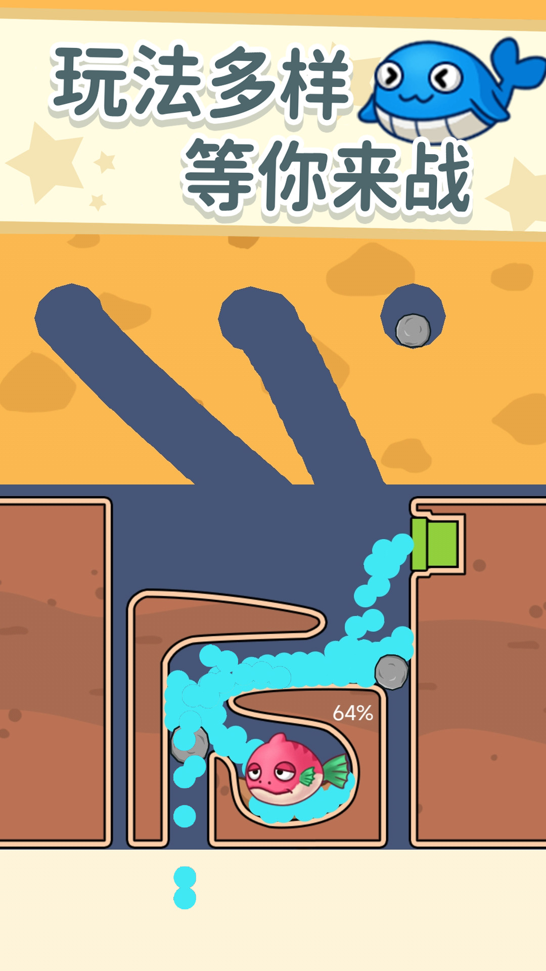 3、让石头滚动到缺口处但是别堵住水流动哦!否则无法到达小鱼的坑里。