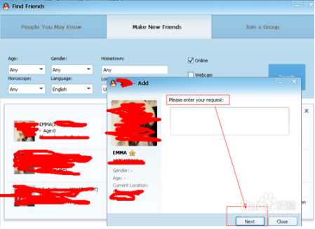 7、选定之后,将电脑鼠标挪到该客户上,点发生的 号,在弹出来的文本框中键入你的请求,随后点Next;