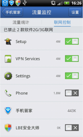 一样,以腾讯手机大管家为例子,拥有ROOT管理权限,大家就可以应用他的“流量管理”作用,对每一个连接网络的手机软件开展操纵了。如下图: