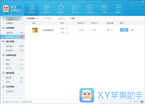 1.开启XY苹果助手,将手机上根据USB线联接至电脑上,待XY苹果助手鉴别出手机上。在网页页面左上角有“程序管理”这一栏,里边表明了手机上中当今全部的运用数,与必须升級的运用数。