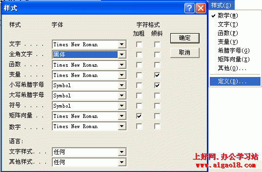 有时候我们在公式计算中必须注解些汉语或一些西文词句。可是公式编辑器默认设置汉语是宋体字,西文会全自动歪斜并不宜全部状况。这就必须采用公式编辑器另一个作用——“款式”了。