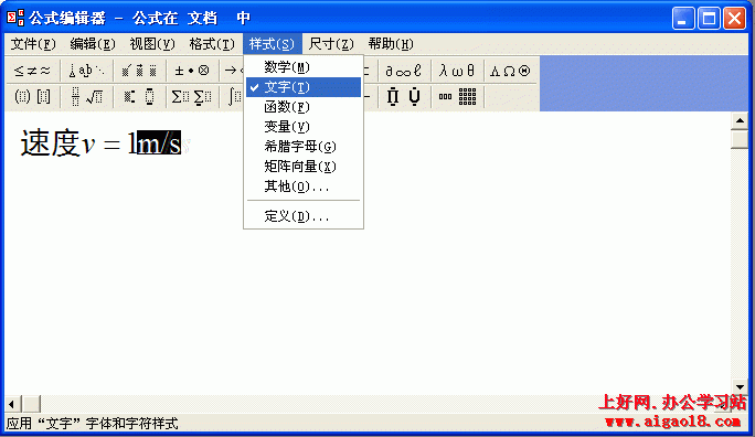 有时候因为有特殊含义,必须把公式计算中的一些西文标识符的歪斜撤销,例如物理单位就不可以应用斜体字,则必须选定该标识符,点一下“款式”-“文本”来修复正体,如图所示5。