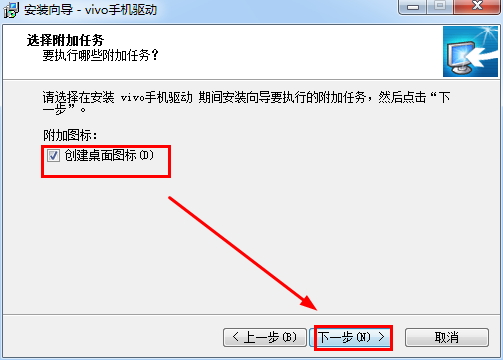 挑选在安裝 vivo手机驱动 期内安裝指导要实行的额外每日任务,随后点一下“下一步”。