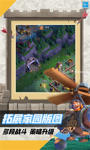 使用全新兵种进行对战,包括狂暴野蛮人、隐秘弓箭手、巨人拳击手、加农炮战车以及新英雄——战争机器。
