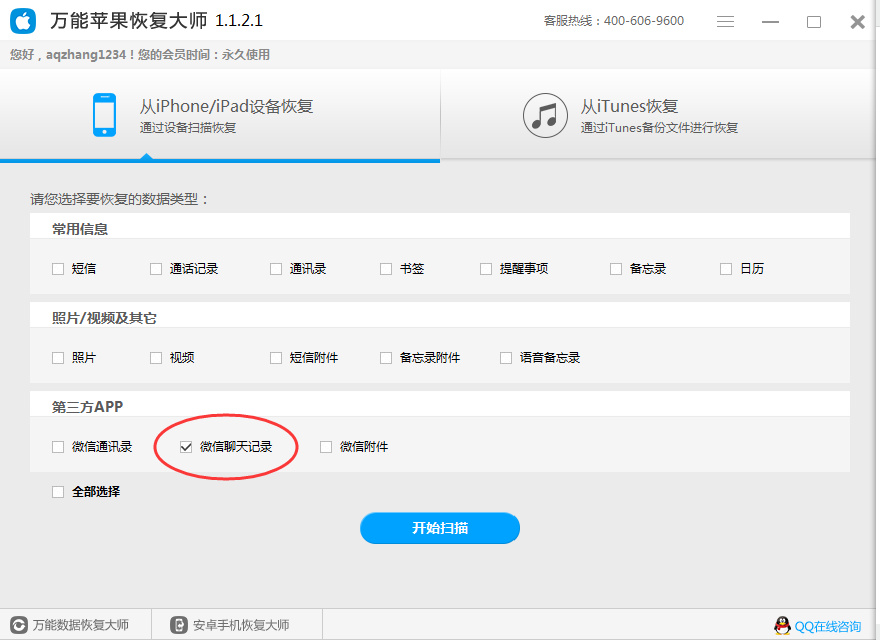 第四步:设备连接取得成功,要修复的基本数据类型挑选“微信聊天纪录”,点击“刚开始扫描仪”手机软件刚开始扫描仪。