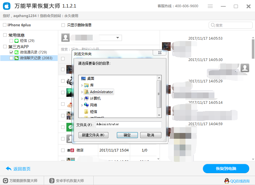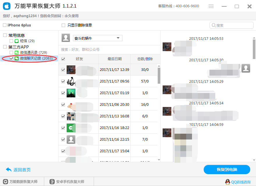 挑选“微信聊天纪录” 扫描仪到的数据信息都适用双击鼠标开启浏览。点一下“修复到电脑上”