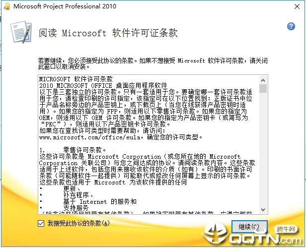 2、进到Microsoft Project 2010安裝协议书页面,您能够先阅读文章协议书中的內容,阅读文章进行后启用左下方的【我接纳此协议书中的条文】,随后点一下【再次】。