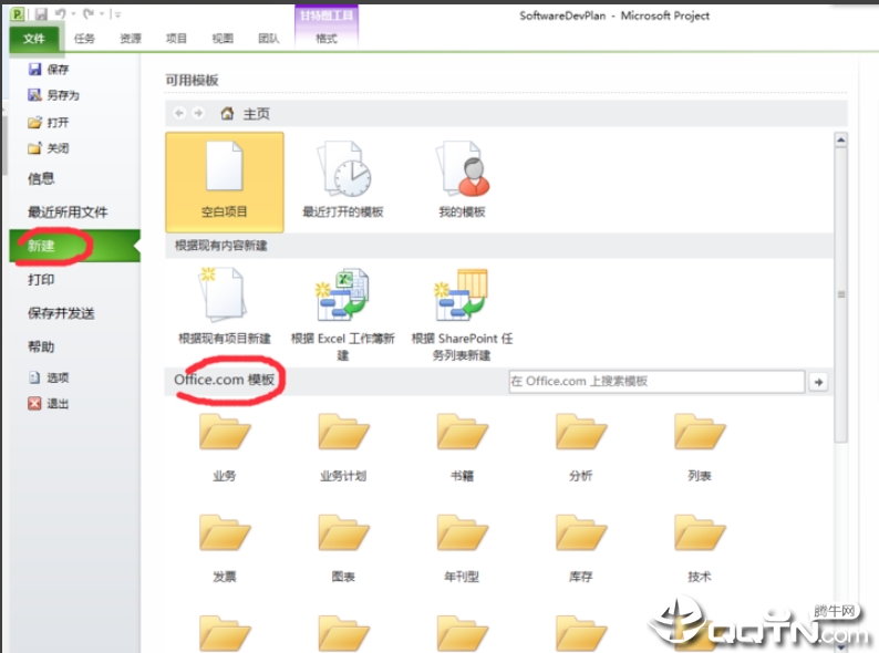 1、开启在本网站免费下载好的Microsoft Project 2010手机软件,打开软件后点击菜单中栏中的挑选 文档在开启的往下拉中点一下新创建选择项, 挑选新项目免费模板。