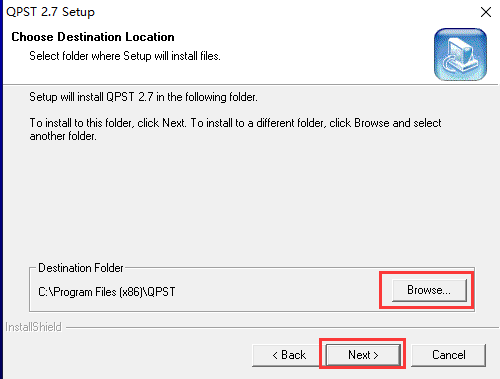 4、进到qpst程序安装部位挑选页面,你能挑选默认设置安裝,立即点一下页面正下方的next(下一步),手机软件会默认设置安裝到系统软件C盘中。或是你能点一下页面中的browse(访问 )选择项,随后挑选适合的安裝部位后,再点一下next。