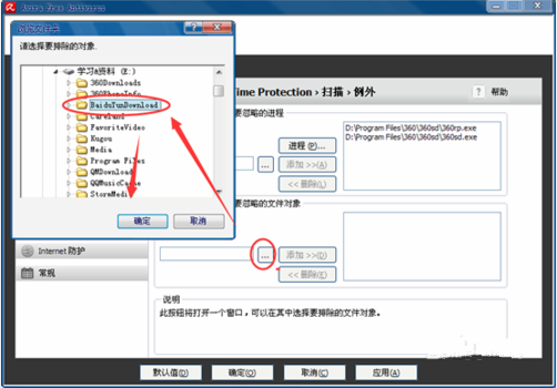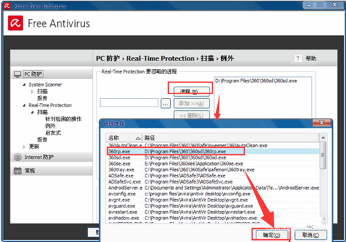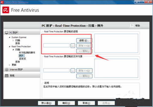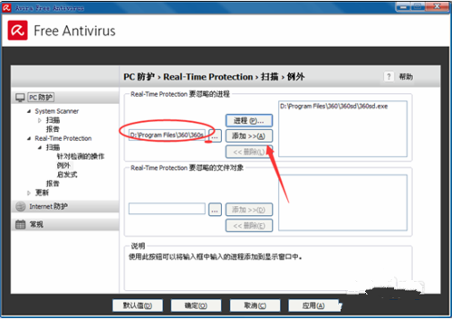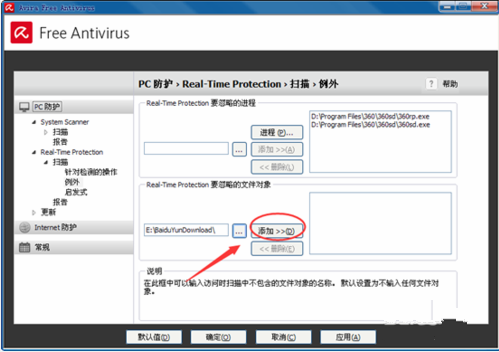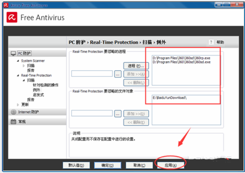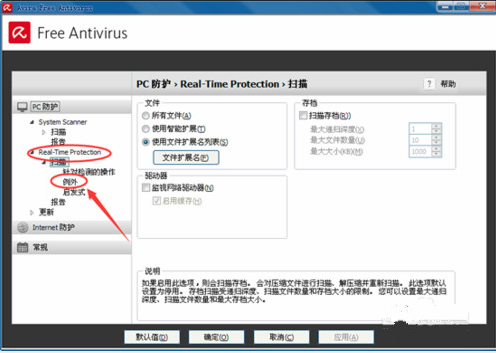 2、开启小红伞配备页面寻找,real-time -protection -----扫描仪----例外莱单 设定