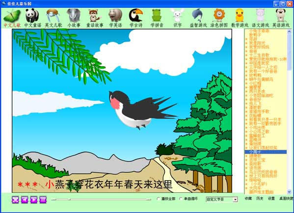 在短故事,成语典故,童话,汉语童谣,汉语儿歌,儿童英文歌曲模块中,不仅有填满奇妙烂漫颜色的神话故事、民间传说;也是有发展思维的童话故事、寓意故事、幽默故事及其顺口的经典儿童歌曲、音乐。并且,全是历经用心裁剪提炼出的、全球小故事宝藏中最脍灸人口数量的名作优秀作品,在其中所表述的对真、善、美取胜的开朗信心,对假、恶、丑的讽刺和绝情鞭笞,针对发展智商,陶冶情操,锻练信念,健全精神实质,都是会有非常大的协助。这种小故事和童谣是滋养小孩子心底的晨露和甘泉。